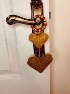 Suspension décorative composée de deux cœurs, réalisée à partir de tissus de seconde main.